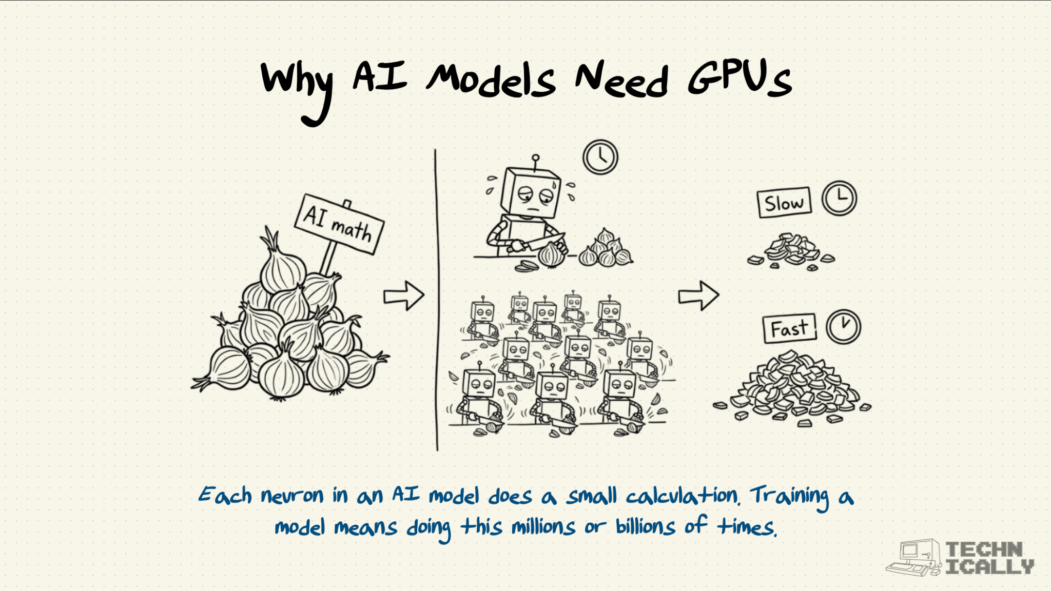 The massive neural network equation is a perfect candidate for parallel computing. It's made up of billions of individual components that themselves are incredibly simple, like slicing an onion. If you can do more than one of these at a time, things would get a lot faster.